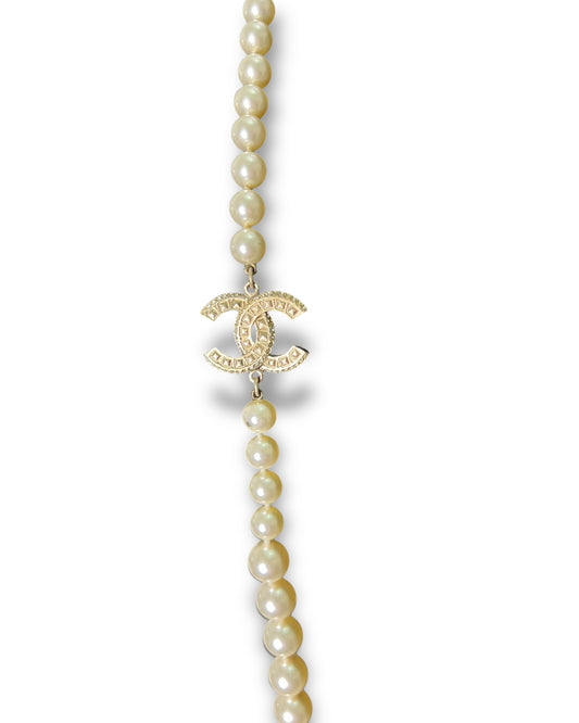 Chanel Faux Pearl Long Necklace Gold Tone CC Logo Double Strand