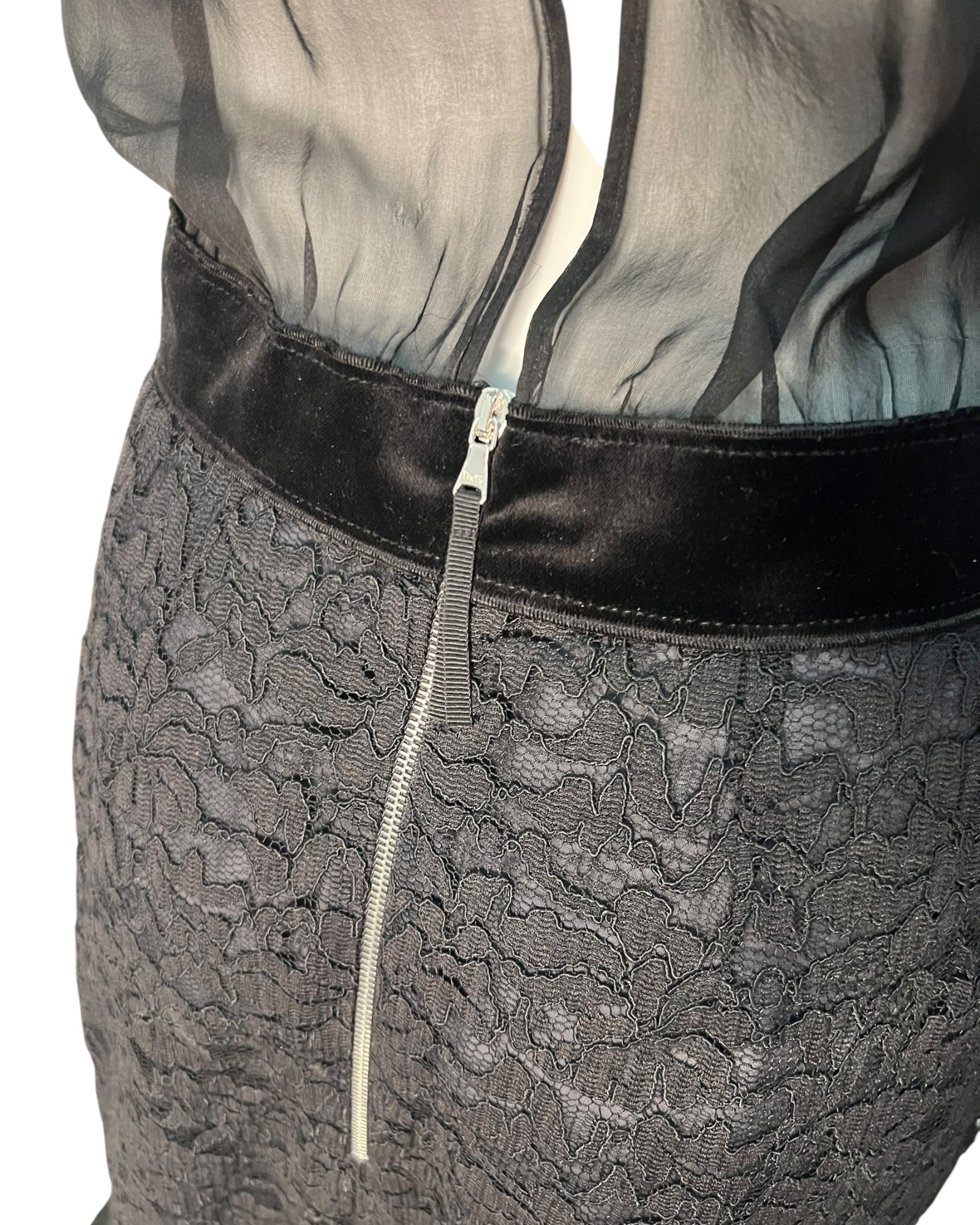 This elegant Dolce & Gabbana dress is a beautifully constructed piece, combining sheer with intricate lace detailing for a refined, feminine finish. The design features a sheer sleeveless bodice with soft gathering at the neckline, creating a fluid and lightweight silhouette through the upper body.