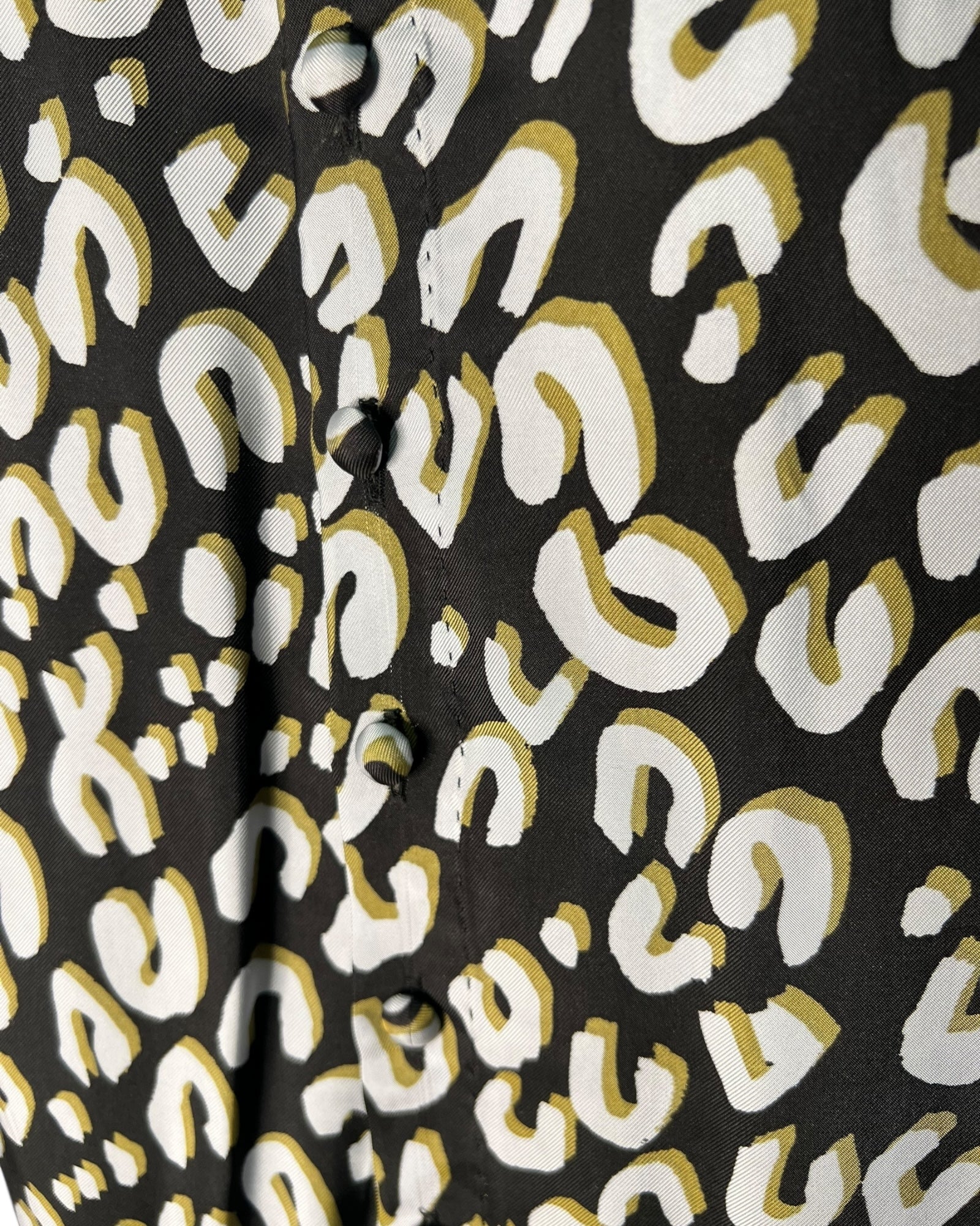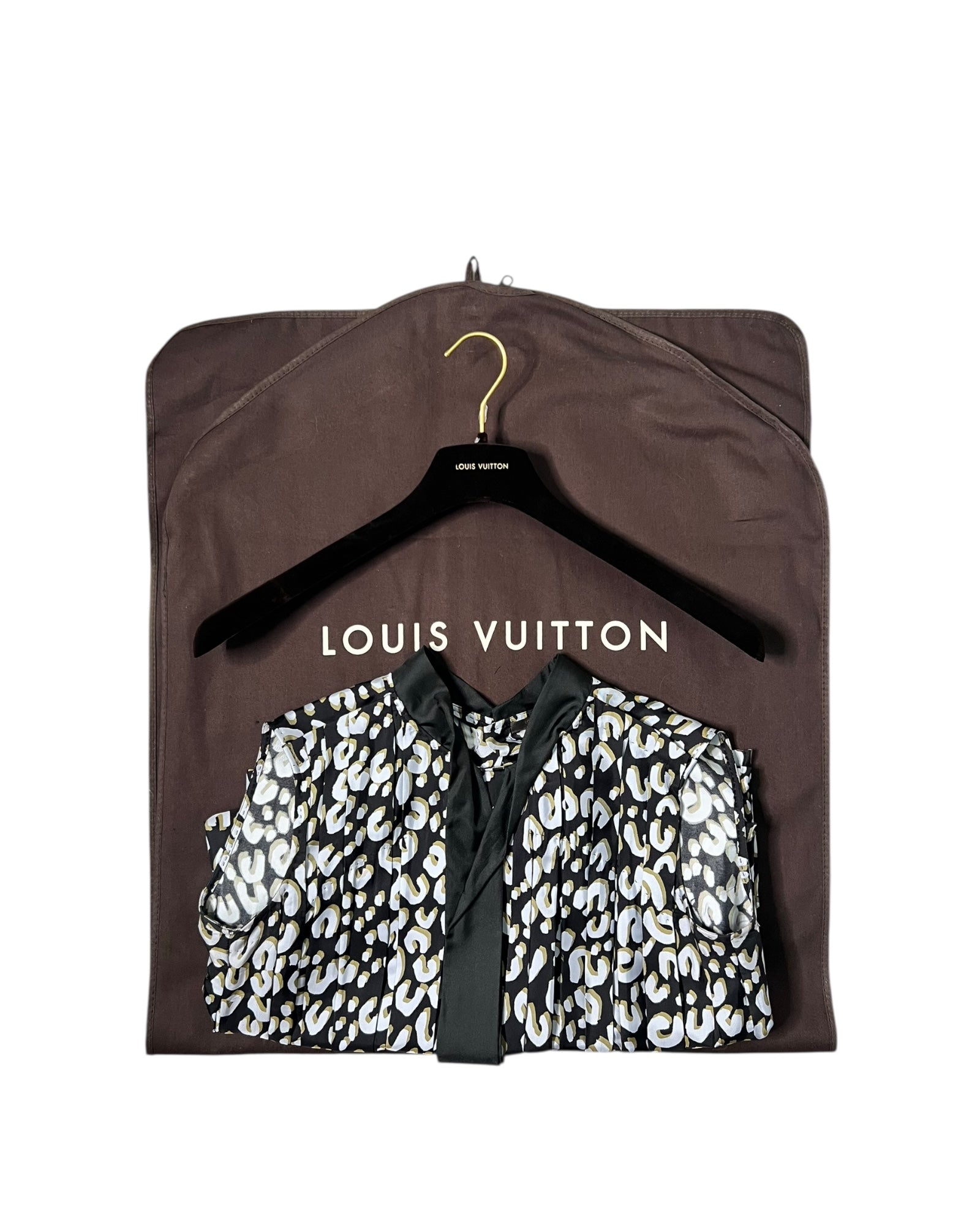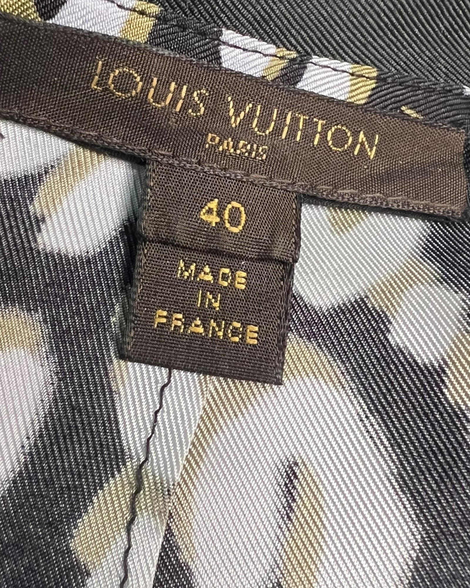 This elegant Louis Vuitton sleeveless dress is a refined and timeless piece, crafted in lightweight printed material with an all-over abstract pattern in black, white and muted gold tones. The design features a high neckline finished with a soft black bow tie detail, adding a classic and feminine touch.